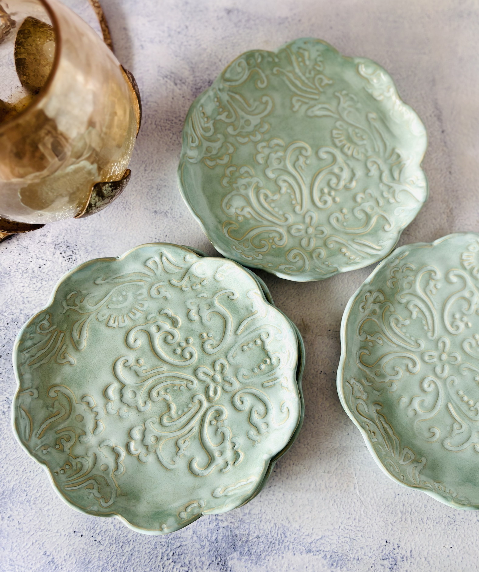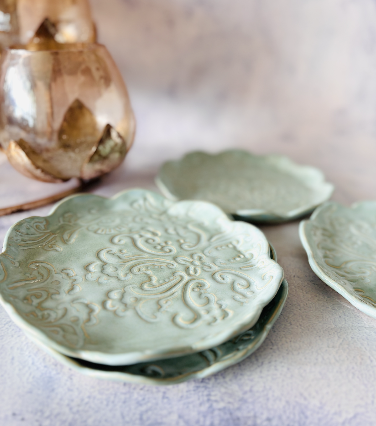 These handmade ceramic appetiser plates are crafted with gently scalloped rims and finished in a calming soft aqua glaze. The beautiful texture beneath the surface subtly shows through, creating depth and character in every plate. The combination of the soothing color and the intricate pattern makes them perfect for serving snacks, starters, or simply adding a touch of artisanal charm to your table.