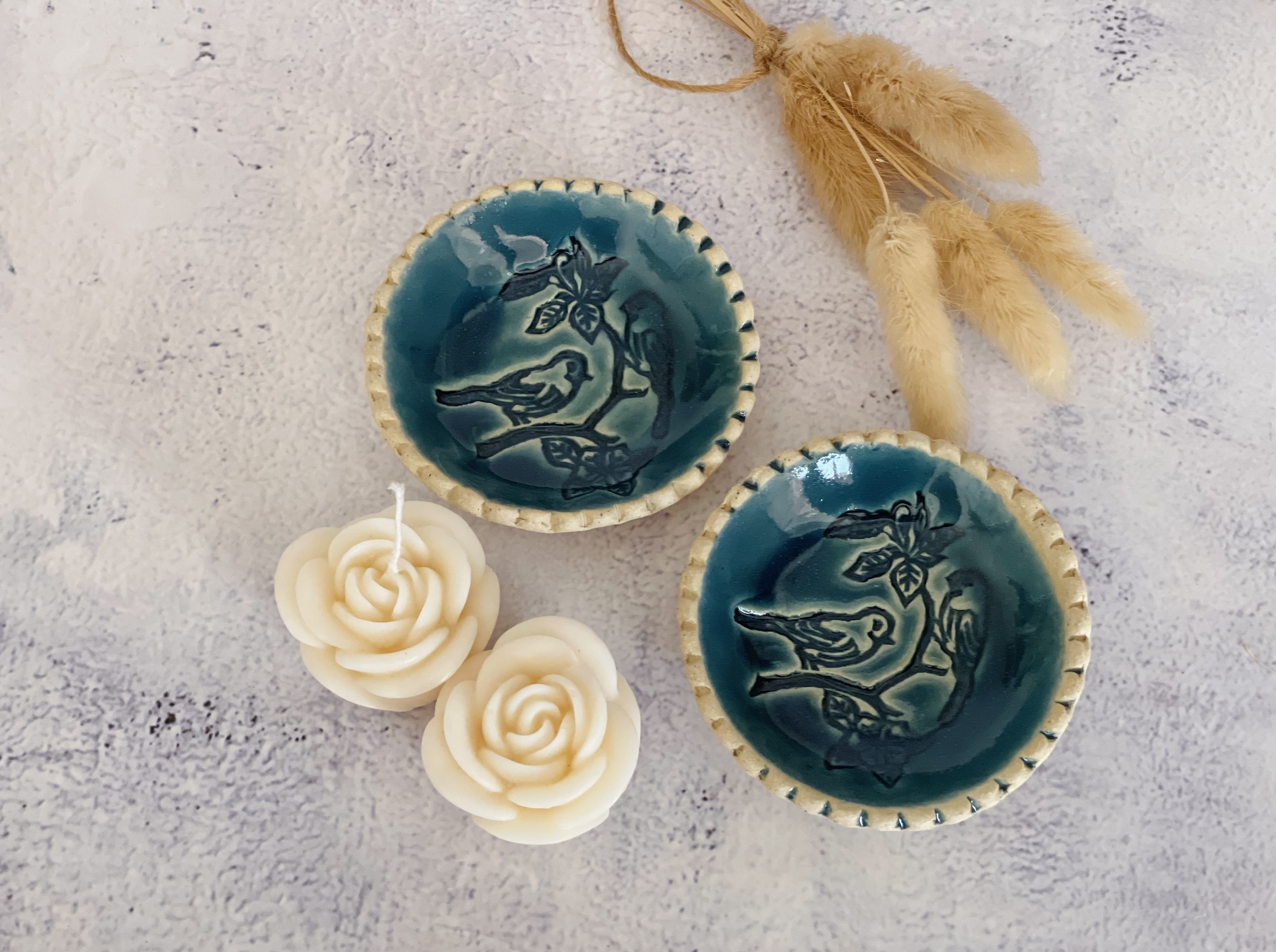 A quiet moment captured in clay—this handmade ceramic trinket dish features delicate bird motifs resting gently on branches, bringing a sense of calm, nature, and stillness into your space.