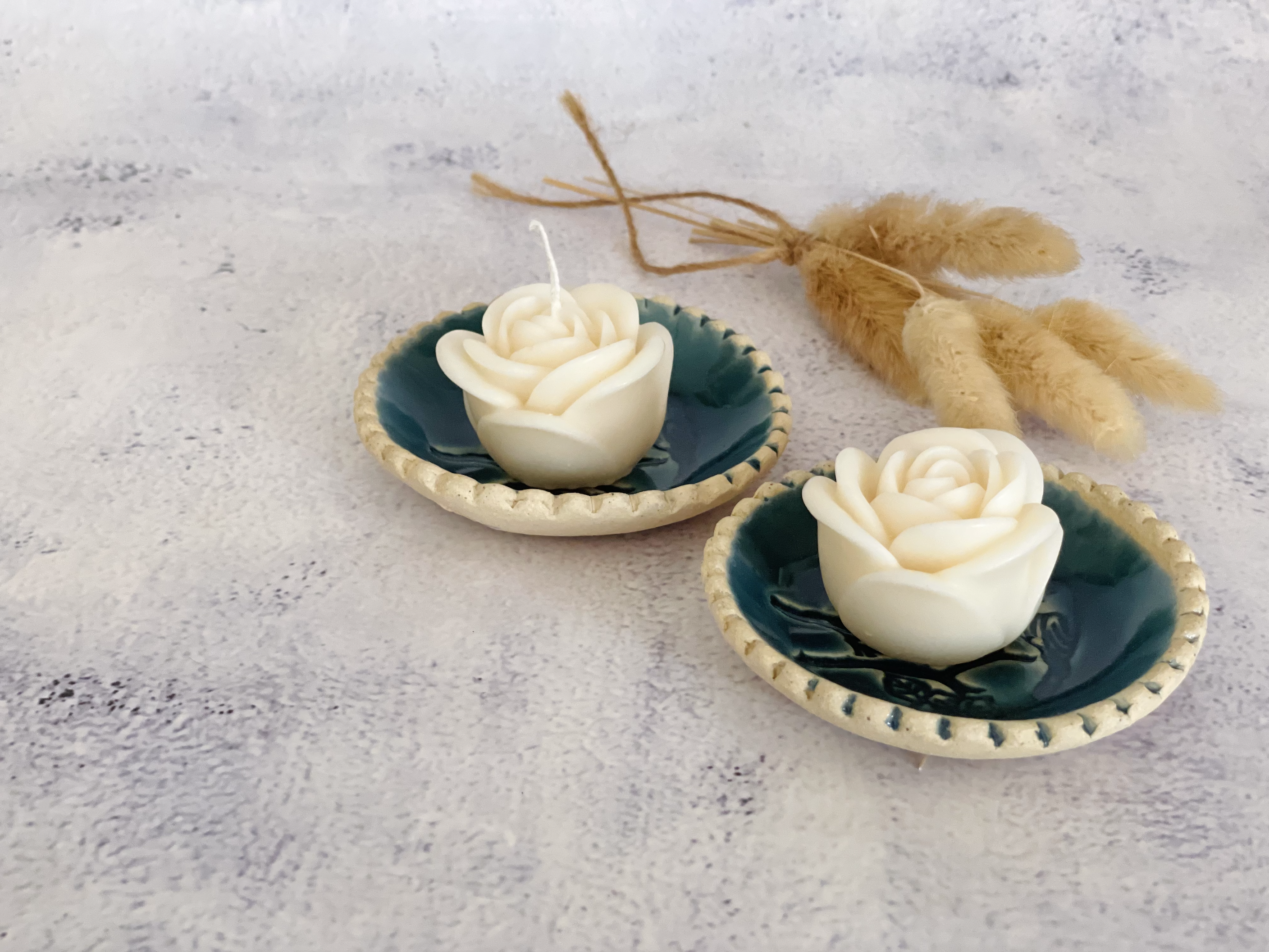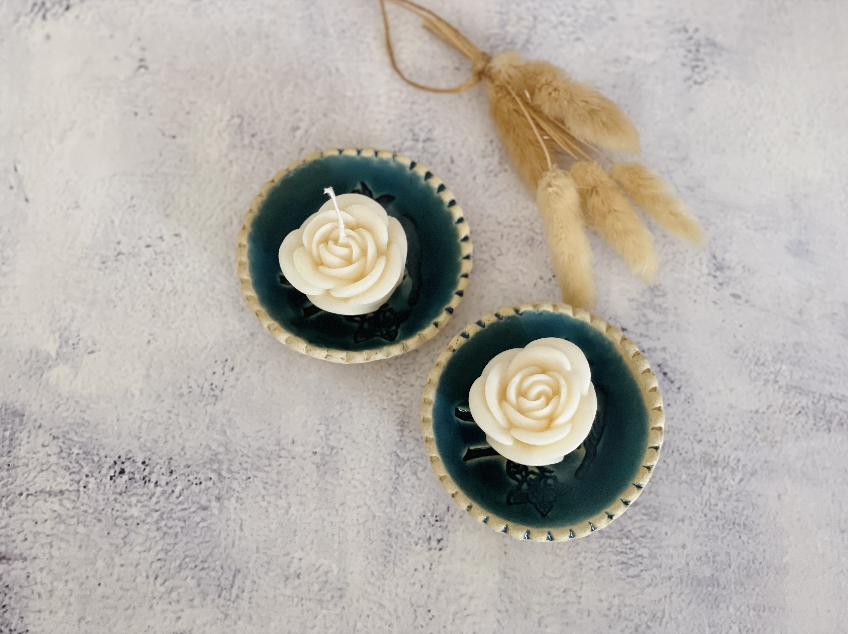 Finished in a rich, glossy dark blue glaze with softly scalloped edges, each dish is paired with a hand-poured soy wax candle, sculpted into a blooming floral form. Together, they create a beautiful balance of art and function—perfect for both display and everyday use.