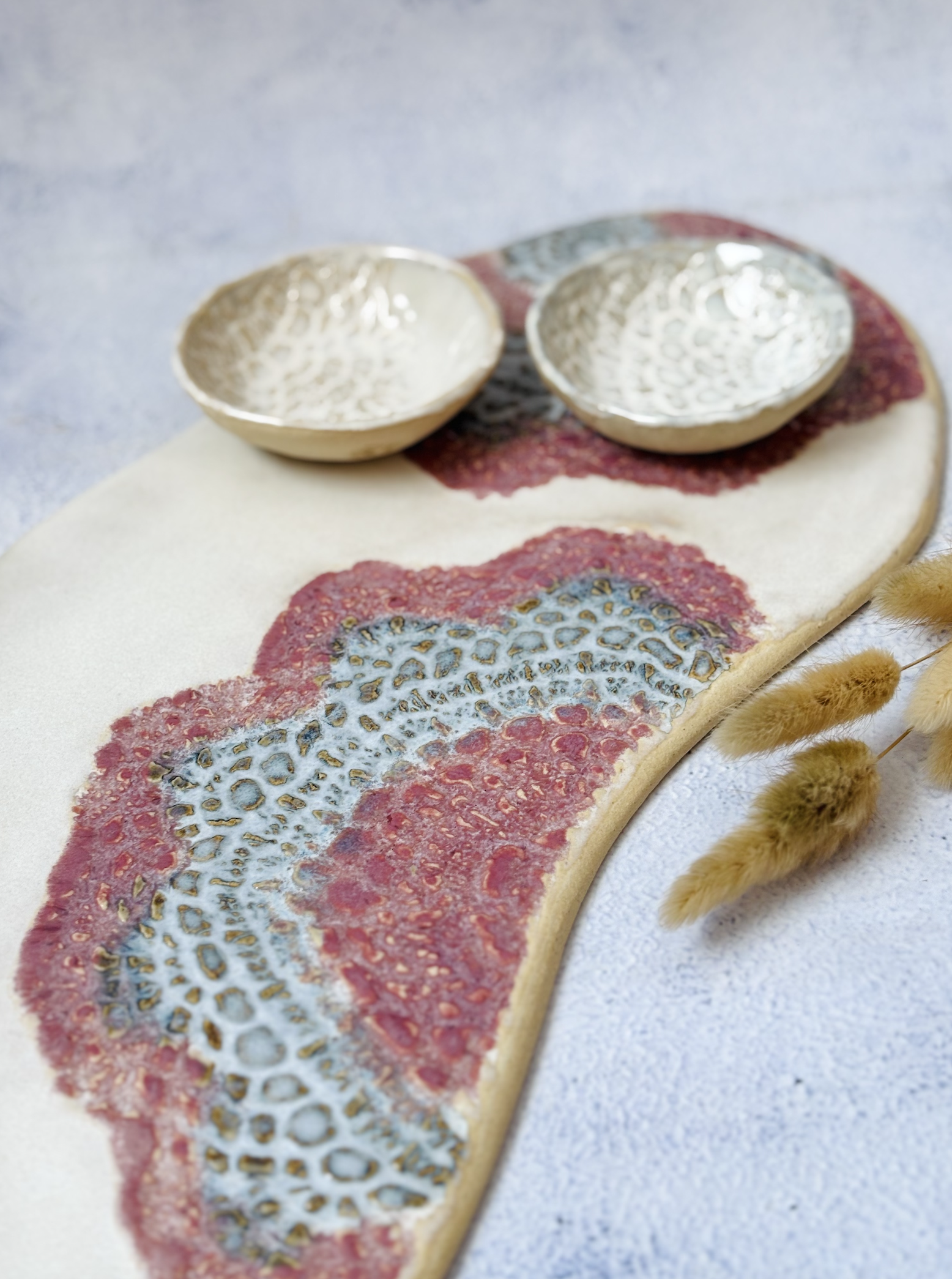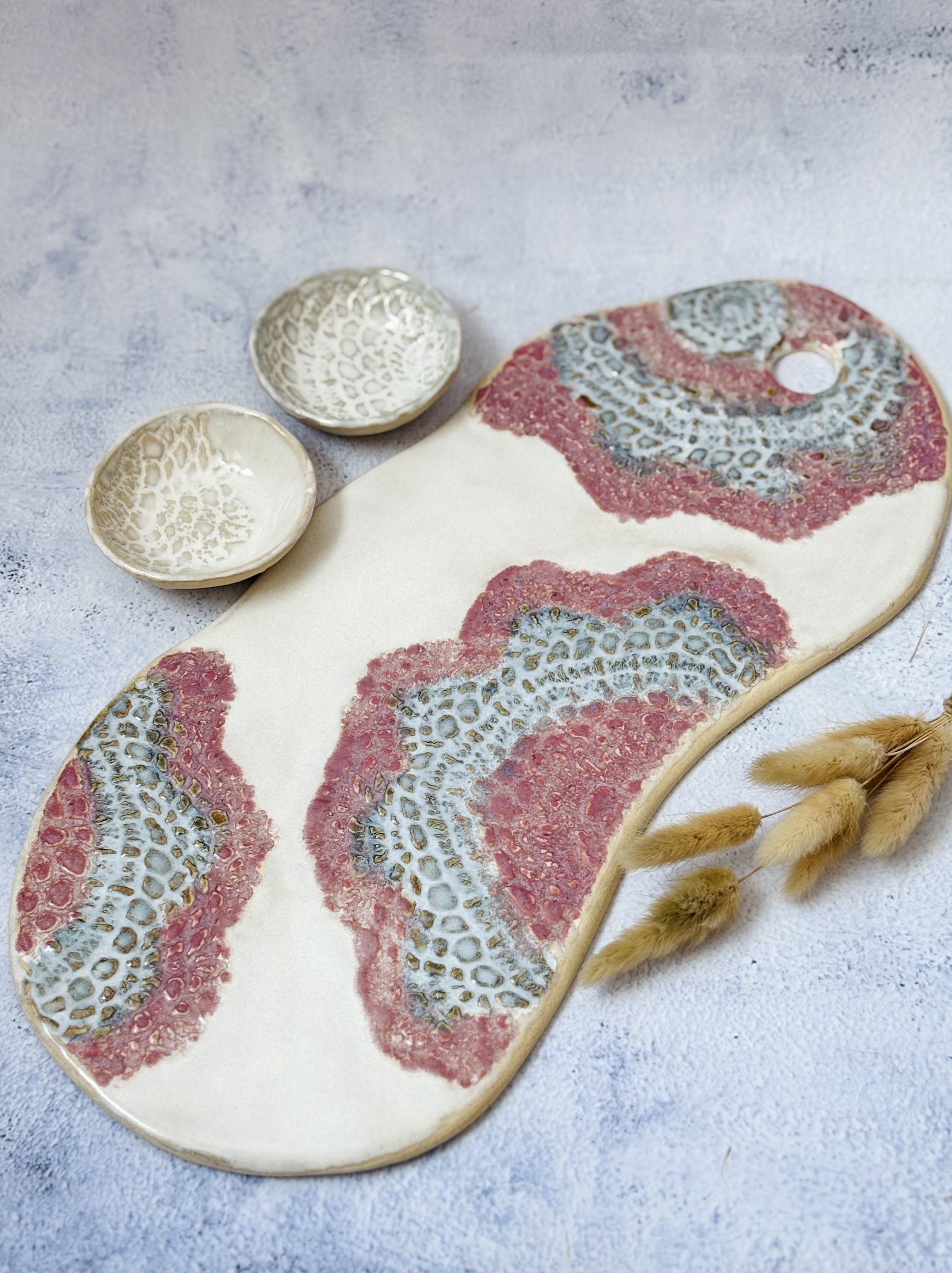 This handmade ceramic cheese platter is a beautiful blend of function and artistry. Shaped with soft, organic curves, the surface features a delicate doily-inspired texture that’s brought to life with gentle washes of soft white, blush pink, and muted blue. The layered glazes highlight the intricate pattern beneath, creating depth and a quietly striking visual rhythm.