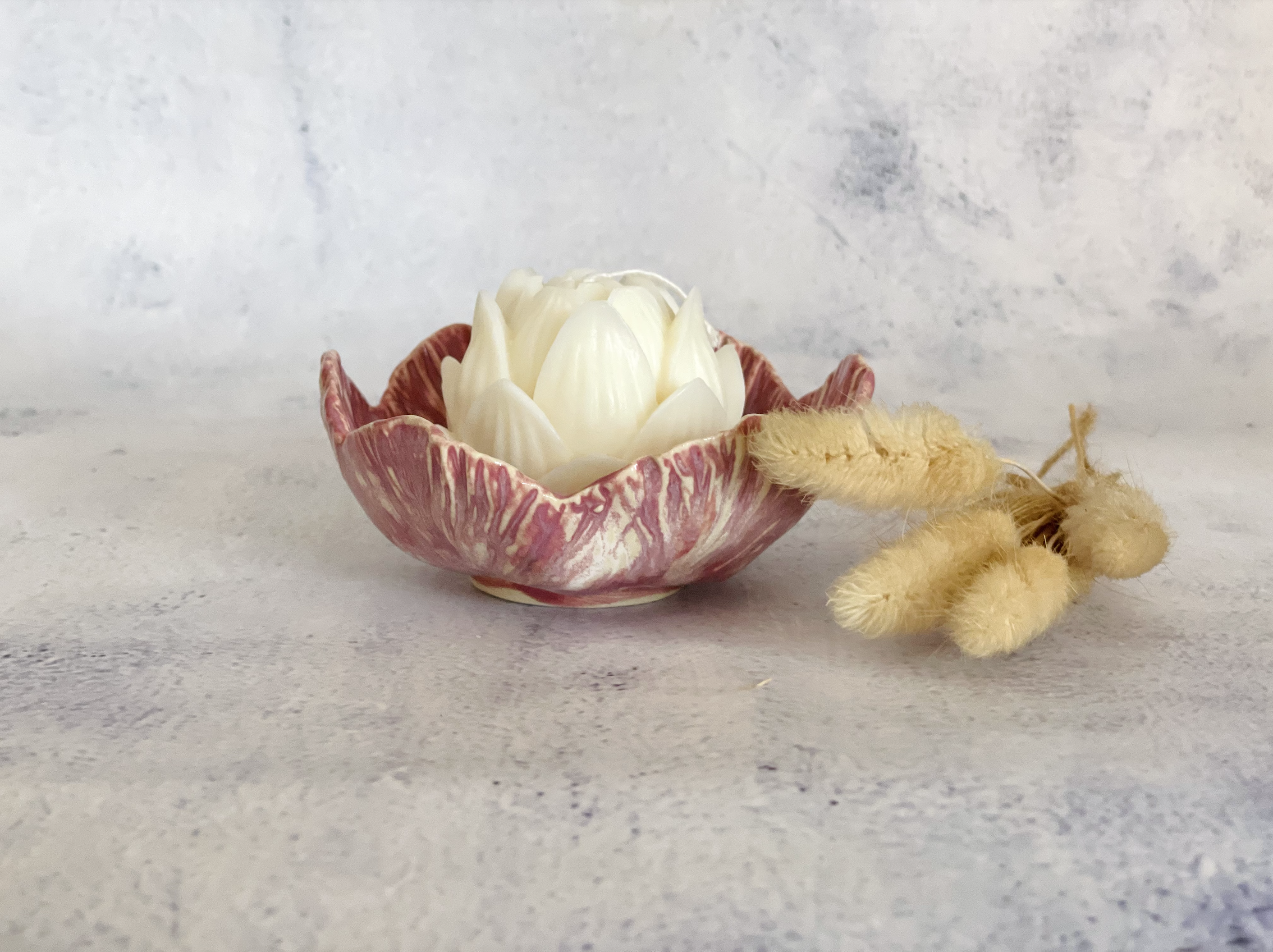 This handmade ceramic flower bowl is paired with a delicately sculpted soy wax lotus candle, creating a piece that feels both serene and special. The softly shaped petals of the bowl are finished in a pink purple glaze, gently cradling the intricate lotus form within.