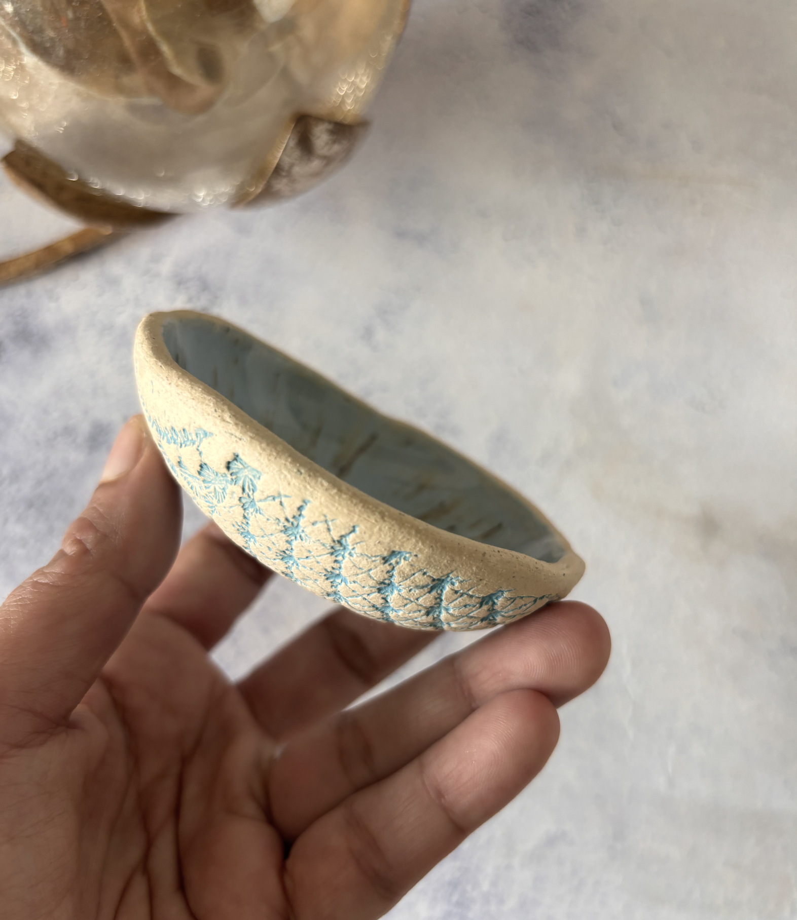 These handmade ceramic tiny bowls are delicate little treasures, crafted with care and finished with a beautiful surprise detail. Each bowl features a smooth, softly glazed interior, while the back is textured with intricate lace impressions, adding depth, character, and a tactile charm to the piece.